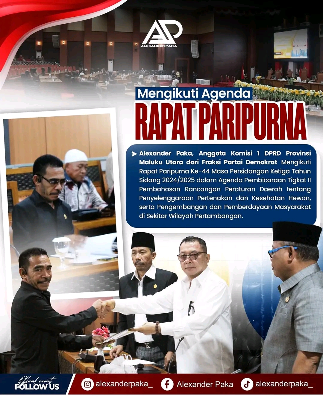 BIDIKFAKTA – Anggota Komisi I DPRD Provinsi Maluku Utara dari Fraksi Partai Demokrat, Alexander Paka, menghadiri Rapat Paripurna Ke-44 Masa Persidangan Ketiga Tahun Sidang 2024/2025, Senin (15/9/25).