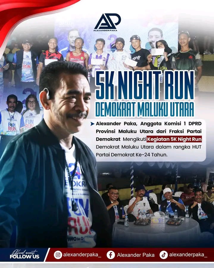 Tak sekadar menghadiri, Alexander juga ikut ambil bagian dalam ajang lari malam sejauh lima kilometer tersebut. Kegiatan ini tidak hanya menjadi simbol perayaan hari jadi partai, tetapi juga sarana membangun kebersamaan, menjunjung sportivitas, serta mendorong gaya hidup sehat di kalangan masyarakat Maluku Utara.