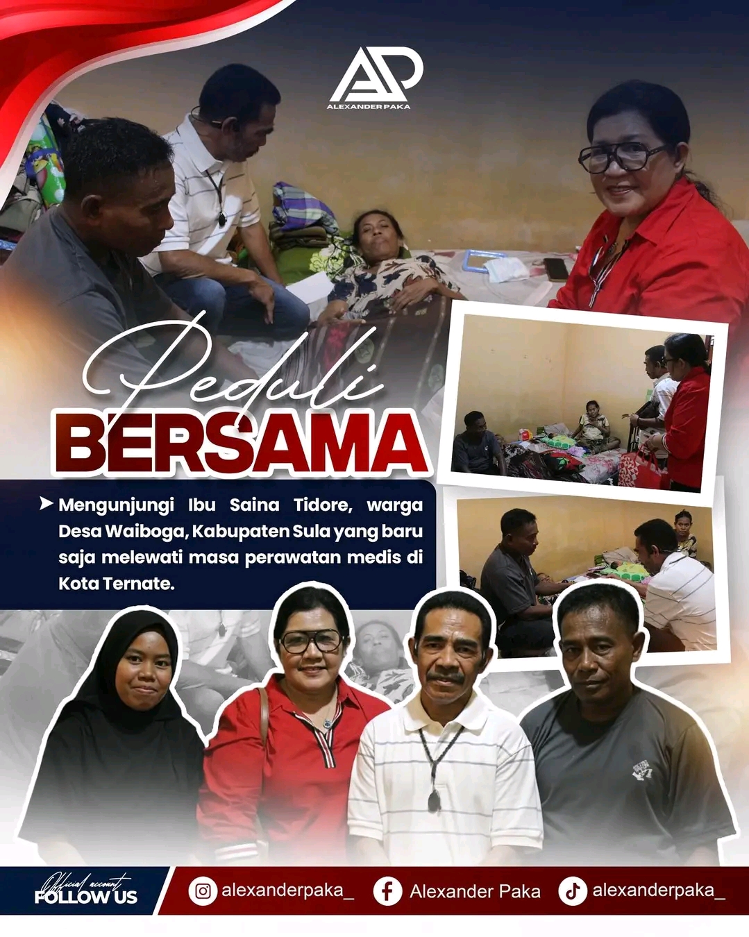 BIDIKFAKTA – Wujud kepedulian terhadap sesama ditunjukkan Anggota Komisi I DPRD Maluku Utara dari Fraksi Demokrat, Alexander Paka. Ia menyempatkan diri menjenguk Saina Tidore, warga Desa Waiboga, Kepulauan Sula, yang baru selesai menjalani perawatan medis di salah satu rumah sakit di Kota Ternate.
