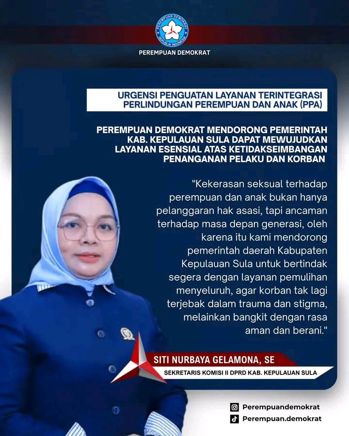 Sekretaris Komisi II DPRD Kabupaten Kepulauan Sula dari Fraksi Partai Demokrat, Siti Nurbaya Gelamona, SE, menegaskan bahwa kekerasan terhadap perempuan dan anak tidak bisa lagi dianggap persoalan biasa. Ia menyebut, tindak kekerasan seksual adalah pelanggaran serius terhadap hak asasi manusia dan merupakan ancaman nyata bagi masa depan generasi penerus.