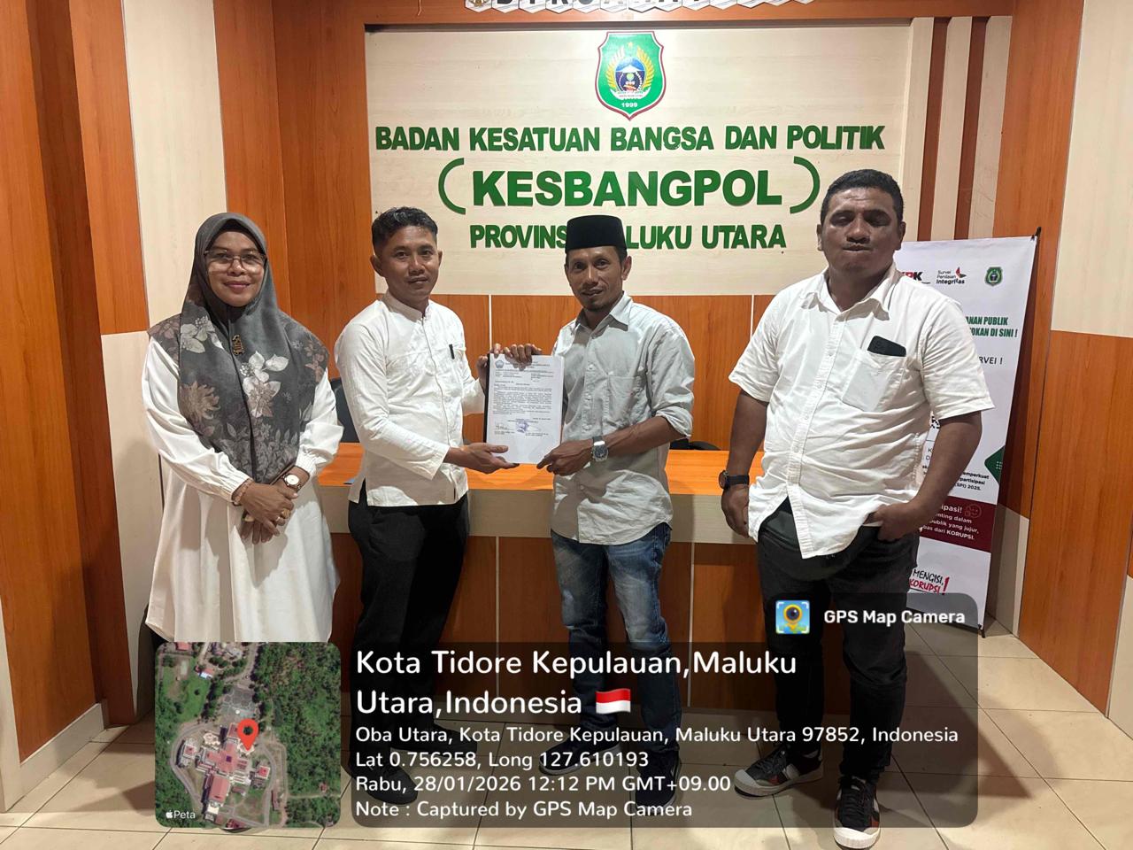 BIDIKFAKTA – Pengurus Pusat Himpunan Pelajar Mahasiswa Sula (PP-HPMS) resmi mendaftarkan organisasi kemasyarakatan ke Badan Kesatuan Bangsa dan Politik (Kesbangpol) Provinsi Maluku Utara, Rabu (28/1/2026). Pendaftaran tersebut diterima langsung oleh Pelaksana Harian (Plh) Kepala Bidang Organisasi dan Kemasyarakatan Kesbangpol Maluku Utara, Ibu Hj. Mala, bersama jajaran staf.